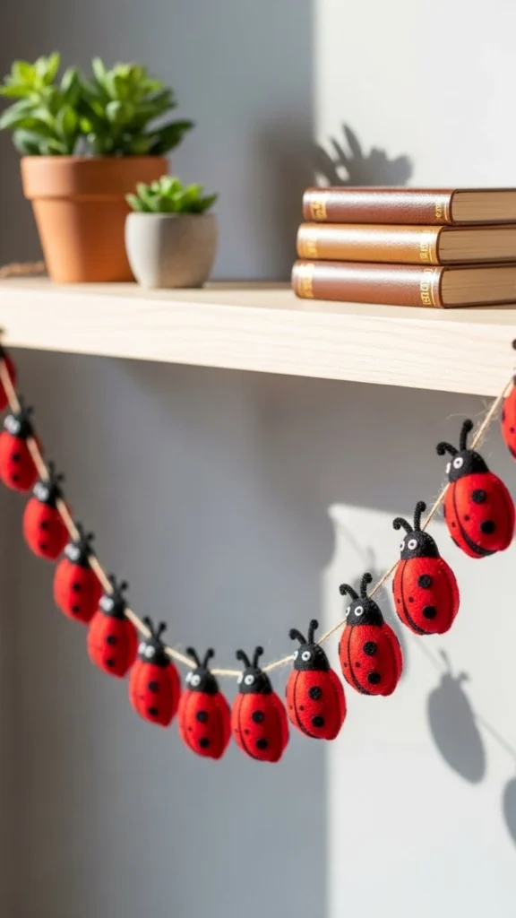 Make small ladybugs using red and black felt. Attach them to a string with glue or stitching. Hang across shelves, windows, or walls for spring décor. Small size variations add charm. Quick, inexpensive, and beginner-friendly project.