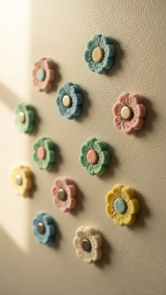 Cut small flower shapes and attach magnets to the back. Place on fridges or metal boards for cheerful spring décor. Scraps can be reused to make multiple magnets. Beginner-friendly and inexpensive. Customizable with different colors and flower types.
