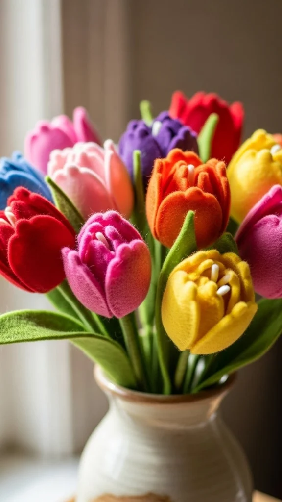 Cut tulip petal shapes from colorful felt and glue or stitch them together. Wrap green felt around thin wire for stems. Layering petals gives them dimension and makes the tulips look more realistic. You can mix different colors for a lively bouquet. These tulips are perfect for vases, table centerpieces, or even small gifts, and using felt scraps keeps the project budget-friendly.