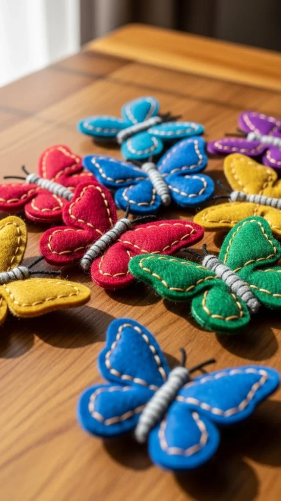 Cut symmetrical butterfly shapes and layer smaller pieces on top for dimension. Stitch or glue the edges and add simple thread details on the wings. They can decorate walls, garlands, or wreaths, adding a cheerful spring touch. Felt is soft, making it easy to shape and forgiving for beginners. Small variations in wing size or color make each butterfly unique.