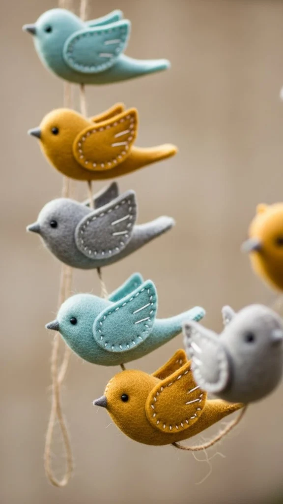 Cut bird shapes from colorful felt and add wings using embroidery thread. Attach tiny felt beaks and small beads for eyes. These birds can hang as garlands or perch on felt trees for playful spring décor. Felt is easy to shape, and layering colors adds depth. Beginners can experiment with different color combinations and sizes to make each bird unique.