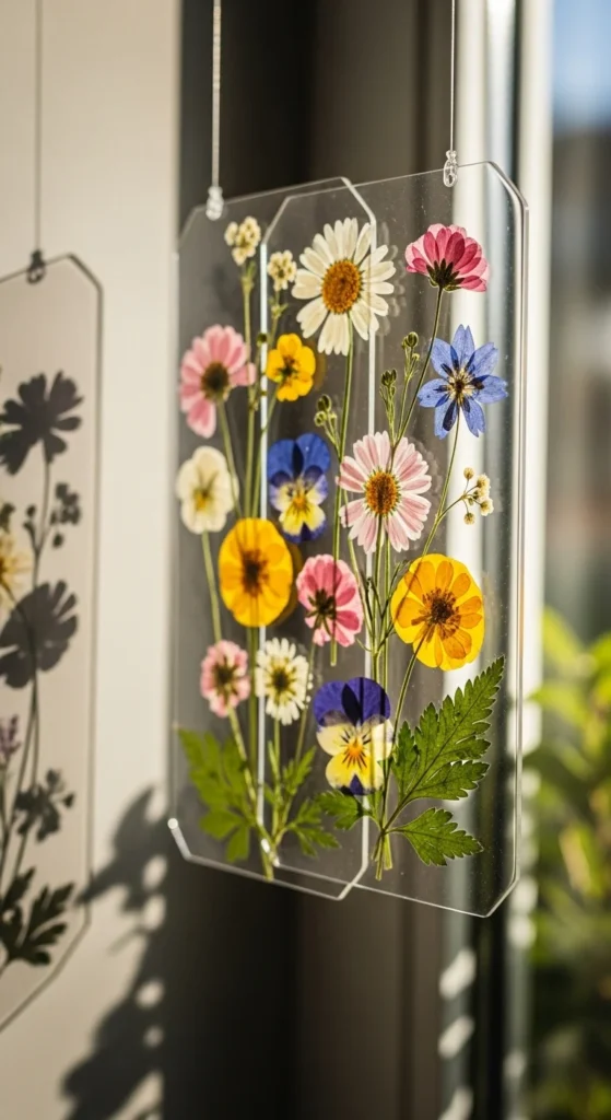 Pressed flower window art brings nature indoors using very few supplies. Collect small flowers or leaves during a walk. Place them between sheets of paper inside a heavy book for several days. Once dry, arrange them between two sheets of clear contact paper.
