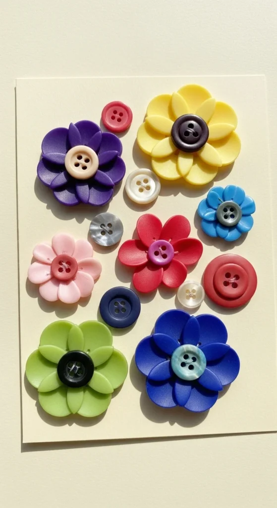 Button flower collages turn leftover buttons into decorative art. Arrange buttons into flower shapes on cardstock, using larger buttons for centers and smaller ones for petals. Once arranged, glue them down and let dry completely. Stems can be drawn, painted, or made from yarn. These collages feel personal and often become keepsakes, especially when using buttons saved from old clothing. The project works well for quiet crafting sessions and allows creativity without mess. Frames are optional, but even unframed pieces look finished. This is a great way to reuse small items that usually sit unused in drawers.