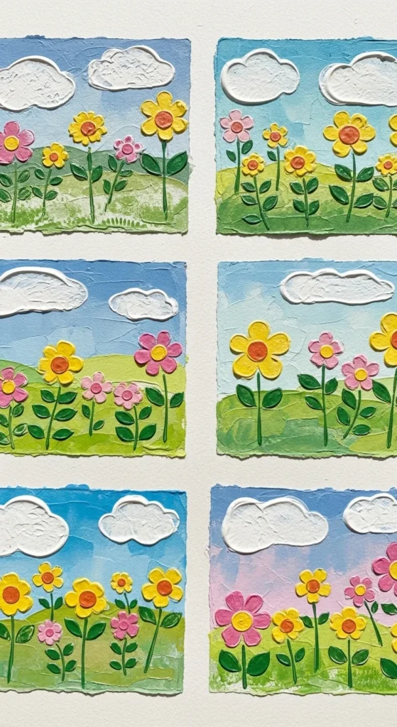 Sponge-stamped spring scenes create layered patterns quickly. Cut household sponges into simple shapes like flowers, clouds, or bugs. Dip them lightly into paint and press onto paper. Layering colors adds depth without effort. This project suits group settings because sponges can be shared and reused. Paint stays controlled, and mistakes blend into the design. Finished scenes dry fast and can be displayed immediately. It’s a low-pressure way to explore color and pattern without drawing skills.