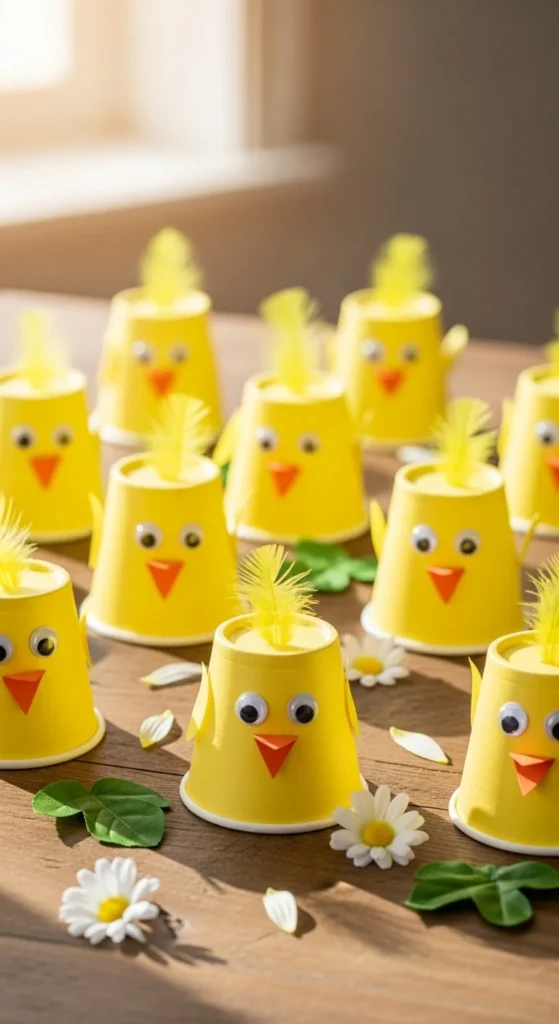 Foam cup baby chicks are quick, playful, and ideal for spring themes. Turn cups upside down, paint them yellow, and add paper beaks, eyes, and feathers once dry. These chicks work as table decor, basket fillers, or simple toys. Foam cups are lightweight and inexpensive, and the craft requires minimal drying time. Even simple faces look expressive, which makes the project forgiving and fun. This works well for classrooms or home crafting days.