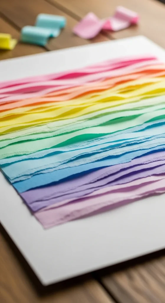 Torn tissue paper rainbows rely on texture rather than precision. Tear tissue paper into strips and glue them in rainbow order onto paper. Overlapping pieces create depth and softness. This craft builds color awareness and coordination without needing scissors. Tissue paper packs last through many projects, keeping costs low. Finished rainbows feel cheerful and work well as seasonal wall art.