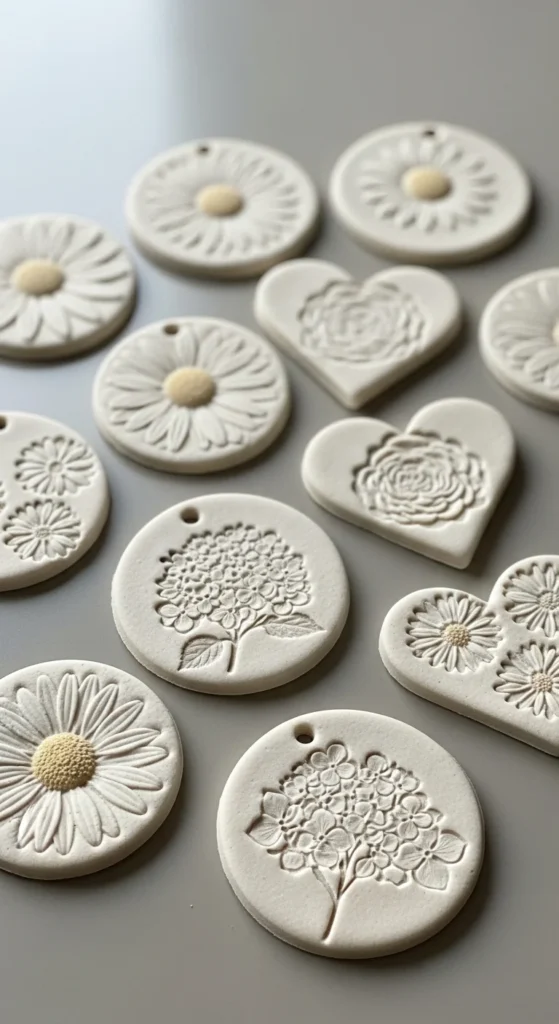 Salt dough flower imprints create keepsake-style decor using pantry ingredients. Roll dough flat, press flowers or leaves into the surface, then bake until firm. Once cooled, pieces can stay natural or be lightly painted. These ornaments work as hanging decor or gift tags. The process feels hands-on and calming, with results that feel personal and lasting.