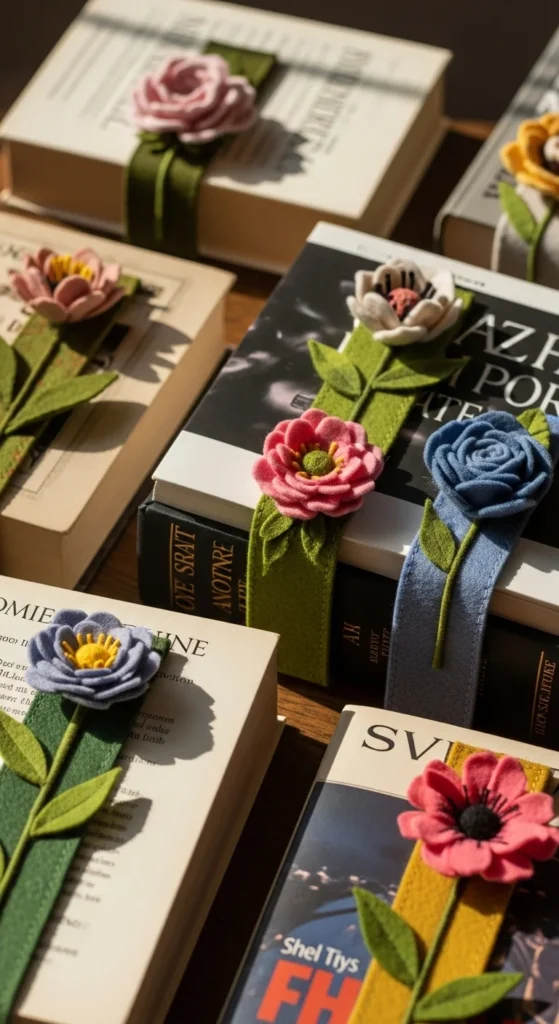 Felt flower bookmarks combine crafting with everyday use. Cut felt into flower shapes and glue or stitch layers together. Add a long felt strip for placement inside books. Felt is inexpensive and easy to store, making this a repeatable project. Finished bookmarks make thoughtful gifts and encourage reading habits.