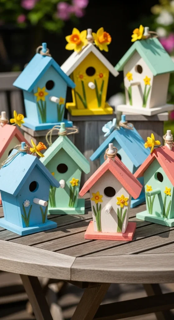 Painted wooden birdhouses allow simple design choices like stripes, dots, or color blocks. Once dry, they can be displayed indoors or placed outside. These projects feel satisfying because they create functional decor. Kits are widely available, and paint colors can match existing decor.