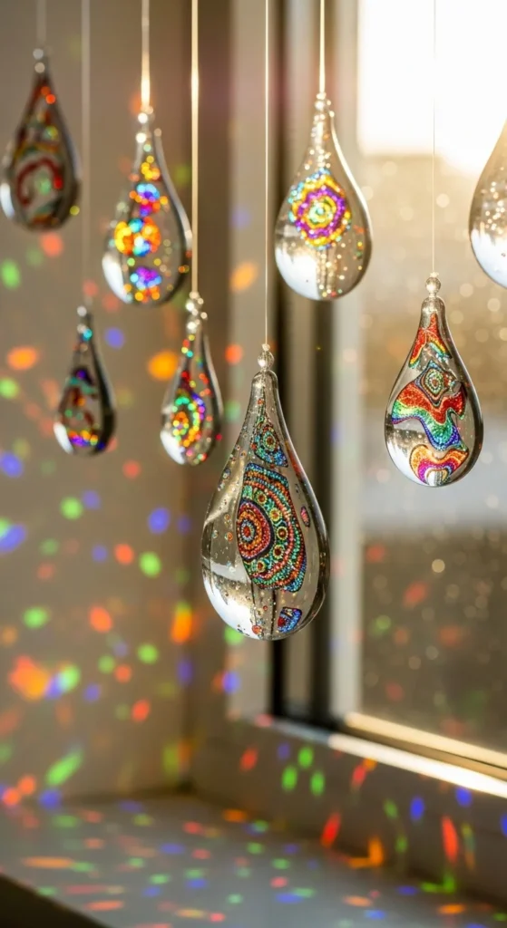 Raindrop suncatchers use clear plastic shapes colored with markers or translucent paint. Hung near windows, they catch light and add movement. Supplies stay minimal, and results feel bright without clutter. These are quick to make and easy to repeat.