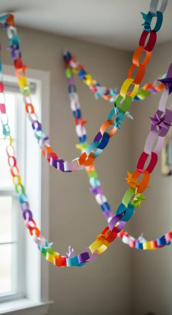 Rainbow paper chains are a classic craft that still works well for spring decor. Cut paper into strips and glue into loops. Scrap paper works just as well as new sheets. Chains can be adjusted to any length and reused year after year.