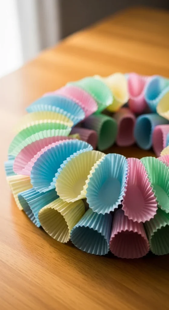 Muffin tin floral wreaths turn pantry supplies into wall decor. Flatten paper liners, arrange them in a circle, and glue them onto a base. Add a simple center detail if desired. The result feels decorative without heavy effort or expense.