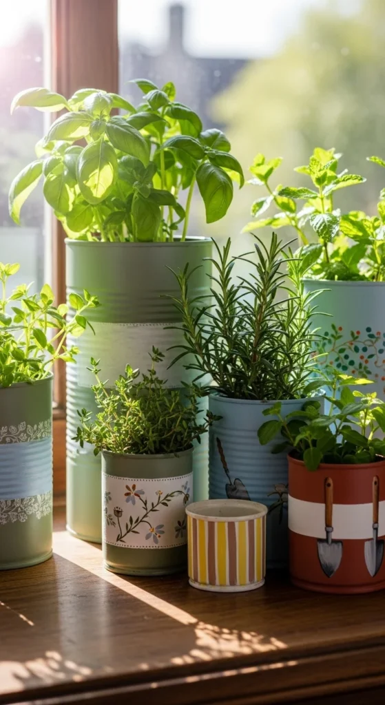 Tin can herb holders reuse household items in a practical way. Clean cans, paint lightly, and use them for herbs or tools. This craft mixes function with decor and works well in kitchens or balconies.