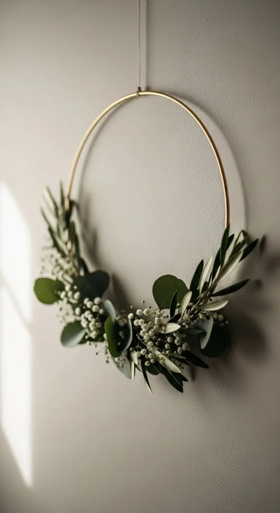 Hoop flower wreaths rely on open space rather than fullness. Wrap greenery or flowers around part of a hoop and hang with ribbon. Small floral bundles go a long way, keeping costs low while results stay modern.