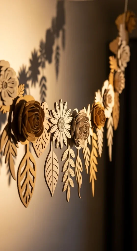 Cardboard spring garlands reuse boxes into seasonal decor. Cut shapes, paint them, and string together. This works well for mantels or shelves and stores flat after use.