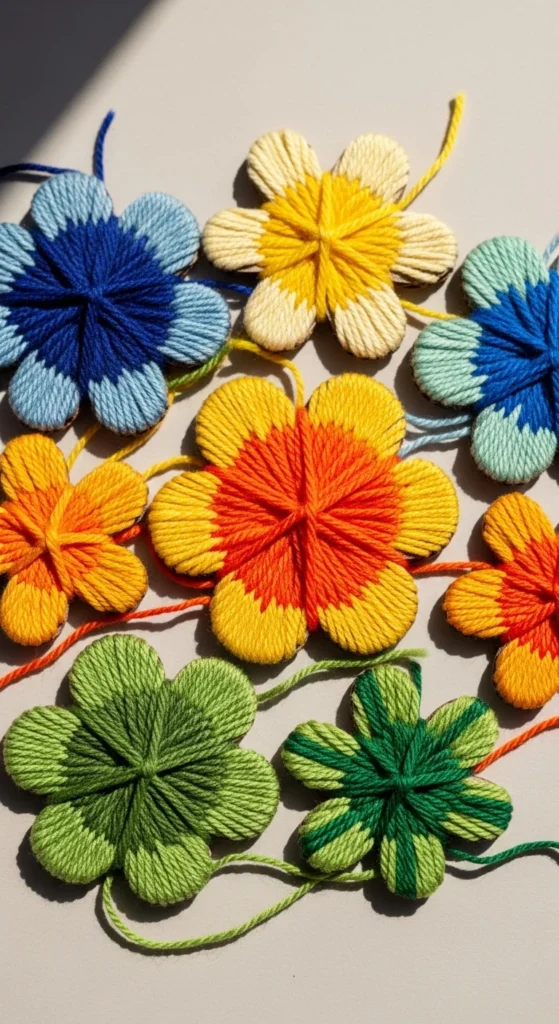 Cut flower shapes from cardboard. Wrap yarn around the shape until fully covered. Secure the ends with glue on the back.