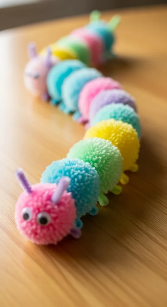 Glue pom-poms in a line to form caterpillars. Add paper eyes or drawn details. Let dry completely.