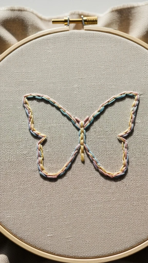 Outlines keep things light. Draw a butterfly shape. Stitch with backstitch or stem stitch.