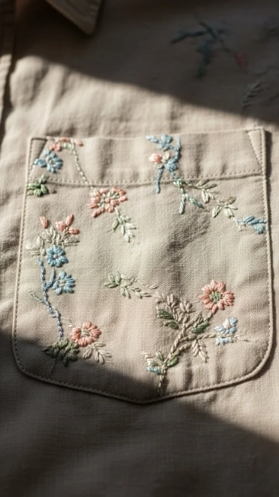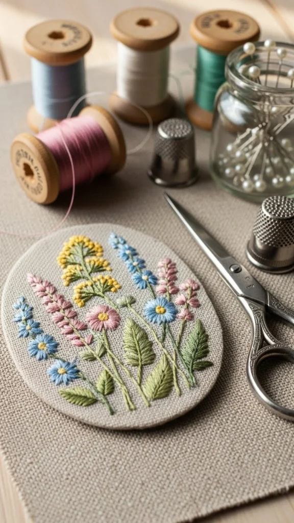 Choose three or four thread colors. Soft pinks, light yellows, and muted greens feel calm. You don’t need exact patterns. Light pencil dots can guide placement. Space the flowers unevenly. That relaxed layout keeps pressure low.