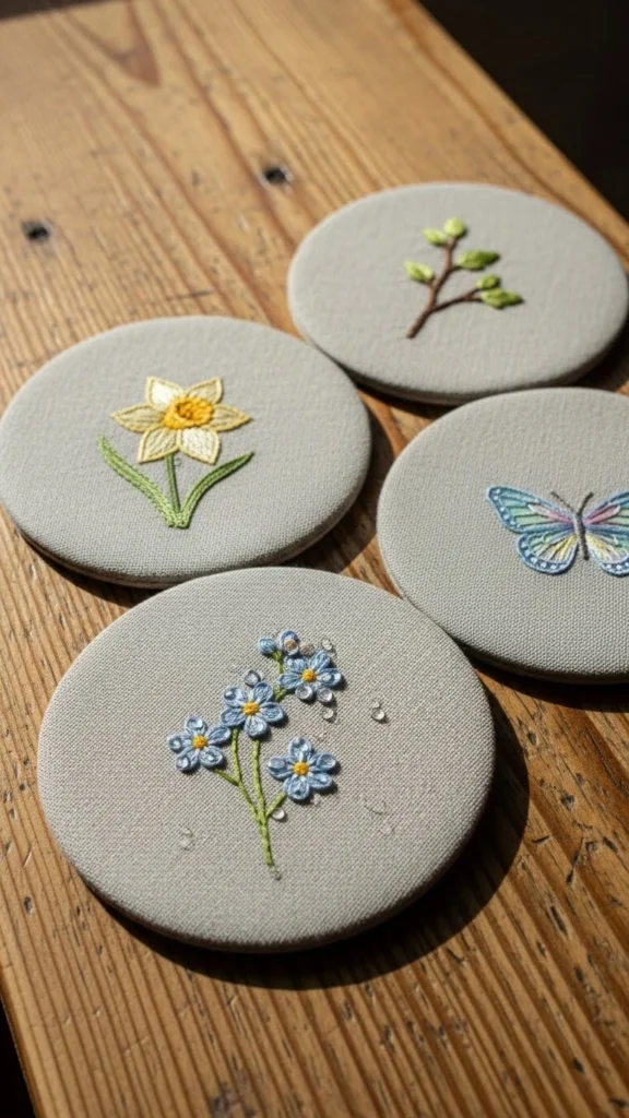 Coasters are practical and small. Stitch a simple flower in the center. Keep it light so the fabric stays flat.