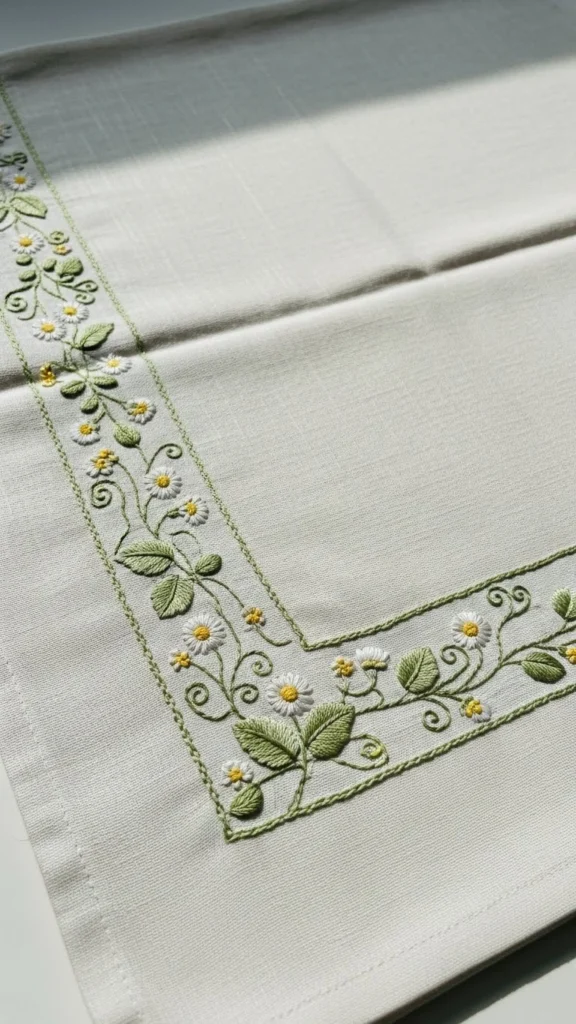 Borders feel structured and calming. Mark a straight line near the fabric edge. Stitch small daisies along it. Keep spacing relaxed.