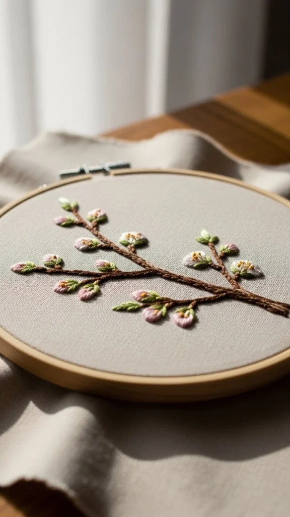 Use stem stitch for the branch. French knots for buds. Simple and steady.