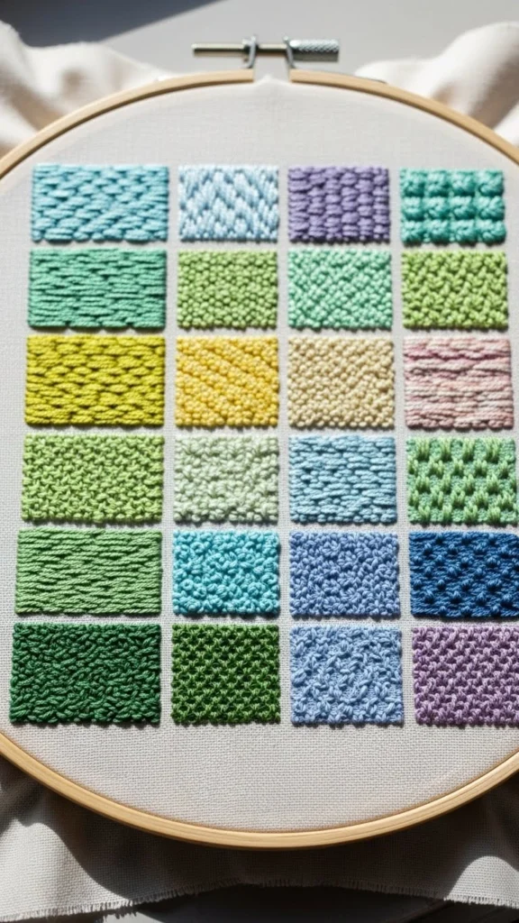 This is ideal for leftover fabric pieces. Old cotton sheets or tablecloths are perfect. Stick to two or three thread colors to keep it calm. Repeating the same motif helps your hands settle into a steady rhythm.