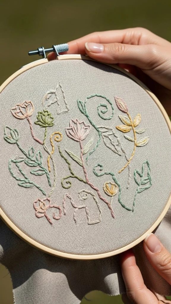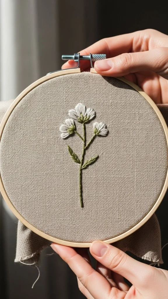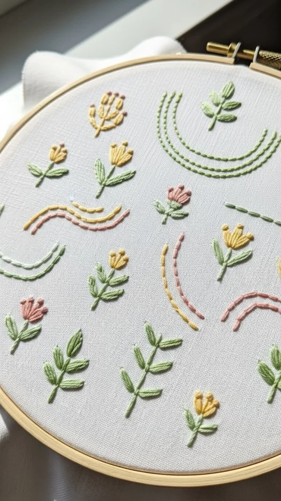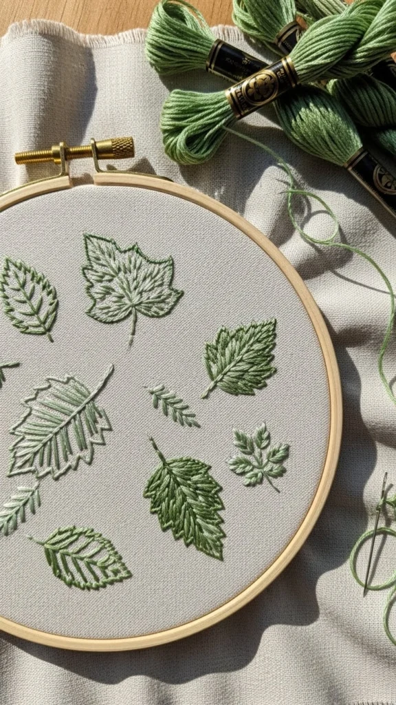 Choose a single design. A sprig. A leaf. A tiny flower. Outline stitches keep it simple. Use one color if you want less decision-making. Earth tones feel gentle on the eyes.