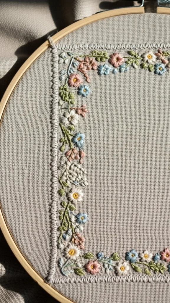 Borders bring a sense of order without feeling strict. This project uses a soft repeating garden pattern along the edge of the fabric. Small flowers, tiny leaves, and simple stems work well. You don’t have to plan the full border in advance. Stitch a few inches at a time.