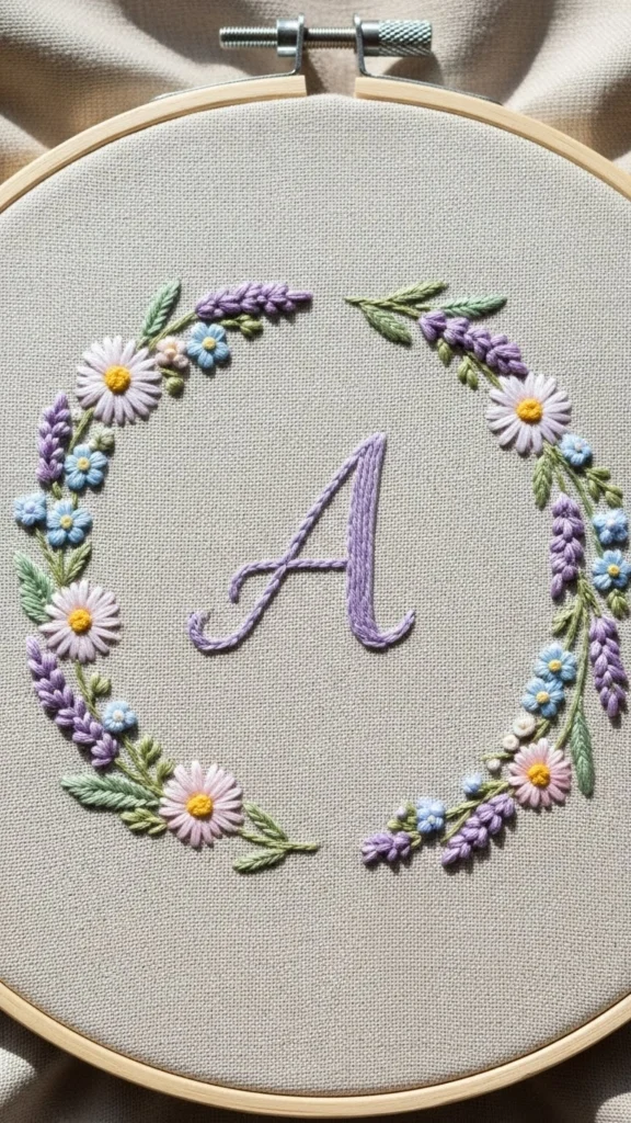 Start with one letter. Trace it lightly onto fabric. Around it, add small flowers or buds. Keep everything minimal. The letter is the focus.