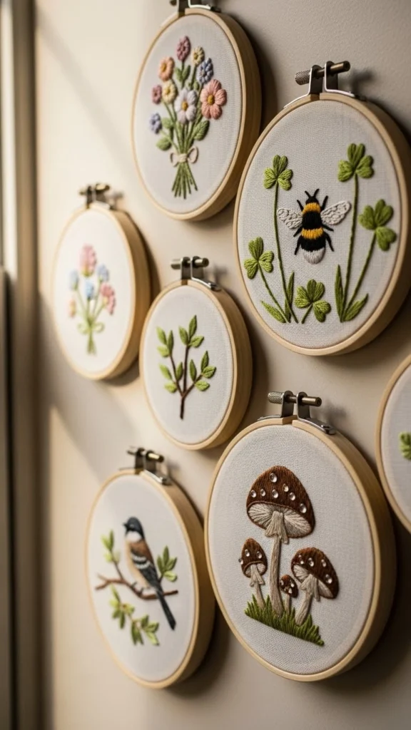 Mini hoops cost less and stitch faster. You can use fabric scraps without waste. Hang them as a group. The variety feels playful but calm.