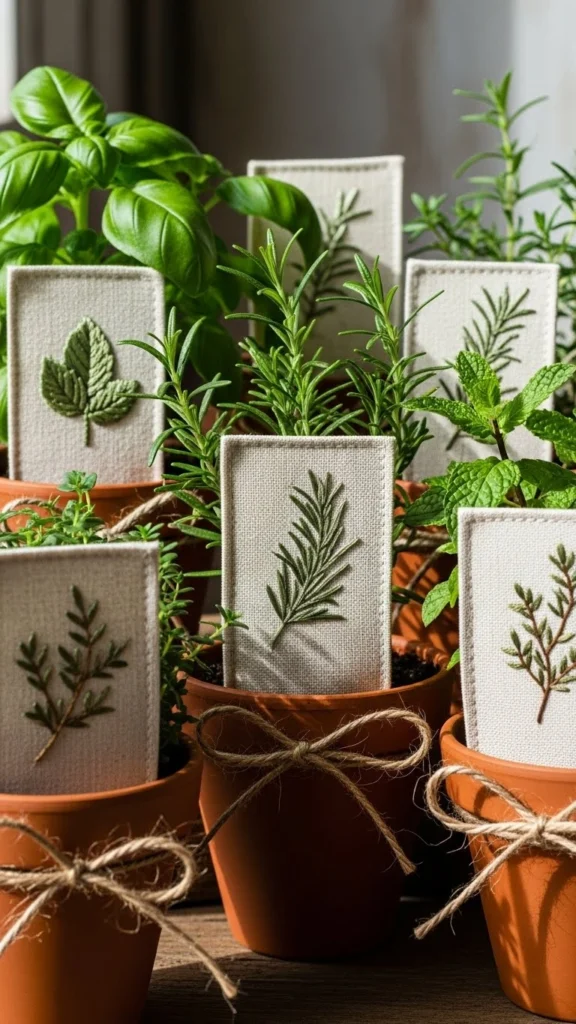 These labels add charm without complexity. Cut small fabric rectangles. Stitch herb names or simple leaf shapes. If letters feel stressful, skip words and use symbols.