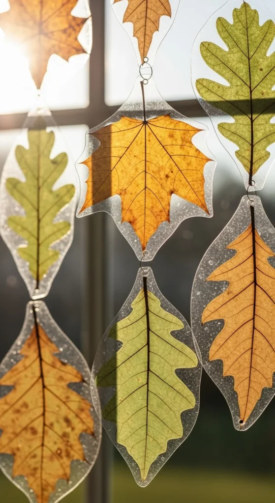 Nature leaf suncatchers are simple to make and look great indoors or outside. Collect fallen leaves with visible veins and press them inside a book overnight. Place each leaf between clear adhesive sheets or laminate pouches and smooth them flat. Punch a small hole at the top and tie string or yarn. Hang them near a sunny window, porch, or fence where light can pass through. This project uses items already around the house and keeps kids busy with sorting and choosing leaves. Clear tape layered carefully works if laminate sheets are not available. Make several at once to create movement and color as the light changes.