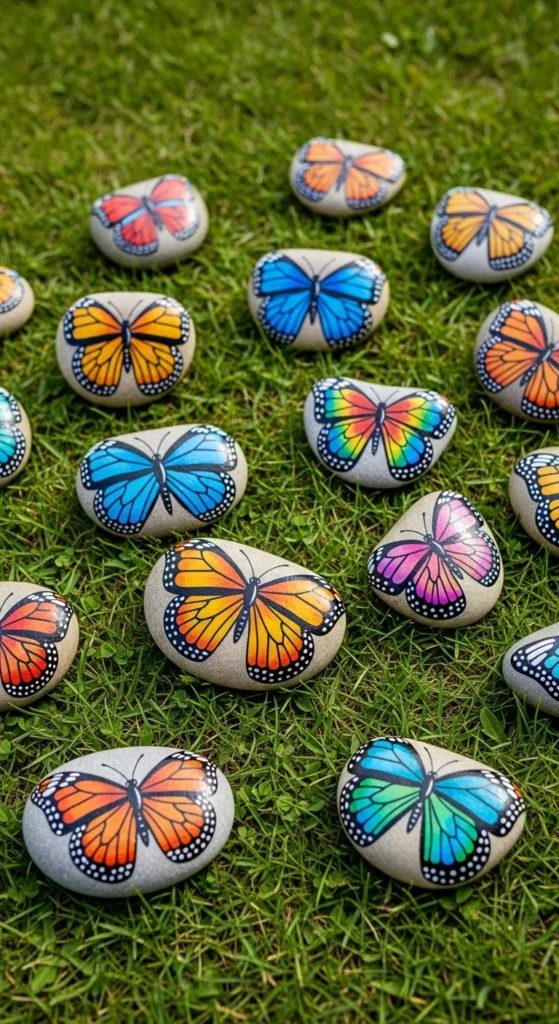 Painted butterfly rocks combine art and outdoor games. Wash stones and let dry. Paint simple butterfly shapes or patterns. Add dots or numbers for learning games. Hide them outdoors for search activities or place them along garden paths.