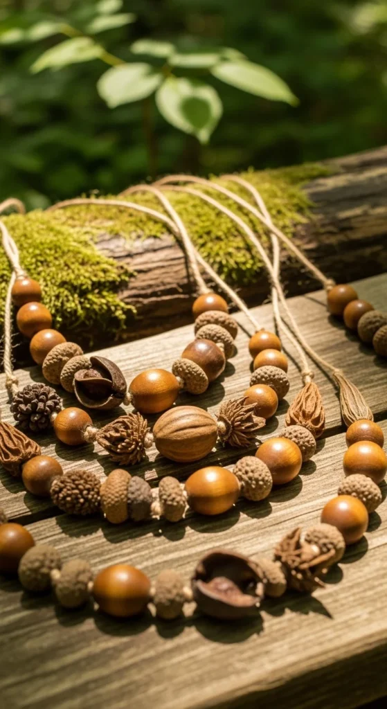 Nature necklaces turn small outdoor finds into wearable keepsakes. Collect acorns, seed pods, small sticks, or wooden beads during a walk. Use string, yarn, or twine and thread the items through natural holes or pre-made openings. Adults can help poke holes if needed using a skewer. Kids choose patterns and spacing, which keeps hands busy and focused. These necklaces work well for pretend play, costume days, or outdoor gatherings. They can be worn briefly and then taken apart to reuse the materials. This project supports hand control and creativity while keeping costs low and materials reusable.