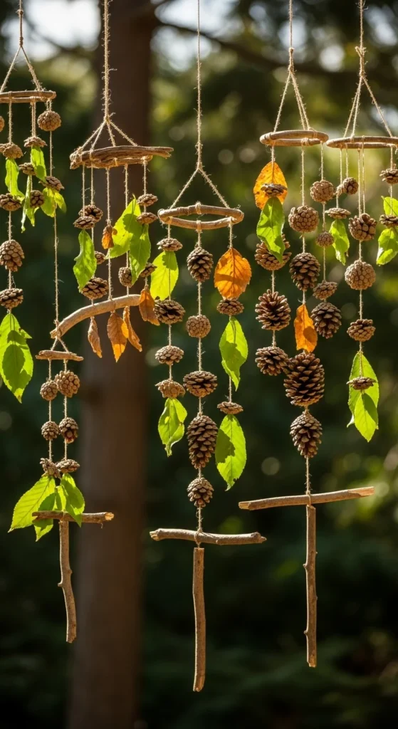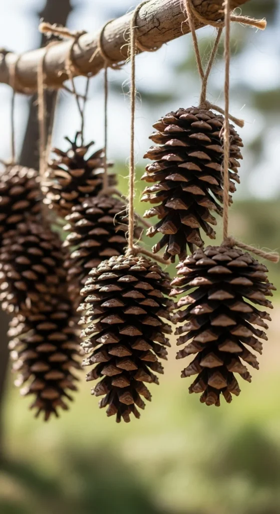 Pinecone wind chimes add sound and movement to outdoor spaces. Collect pinecones of different sizes and tie each one to string or twine. Attach the strings to a sturdy stick or branch, spacing them unevenly so they move freely. Hang the chime from a tree, porch, or fence where wind can reach it. Kids enjoy testing how different lengths affect movement and sound. This craft encourages problem-solving while staying simple. Pinecones can be swapped out or rearranged anytime, making it easy to refresh without starting over. No tools are required beyond string and knots.