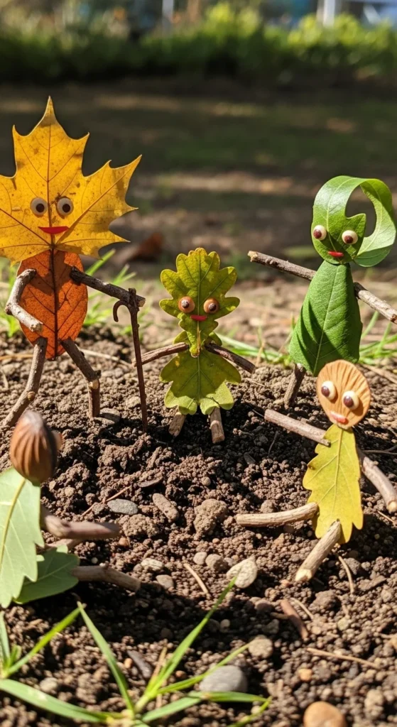 Leaf people characters invite imaginative play using basic shapes. Gather leaves, sticks, and small natural items like seeds or pebbles. Arrange them into people shapes on the ground or cardboard, using leaves for bodies and sticks for arms and legs. Faces can be created with seeds or drawn lightly with markers if desired. The figures can be rearranged into families, scenes, or stories without glue, allowing endless reuse. This activity works well outdoors and supports creativity without pressure to keep a finished product. Once play ends, materials return to nature or get reused later.