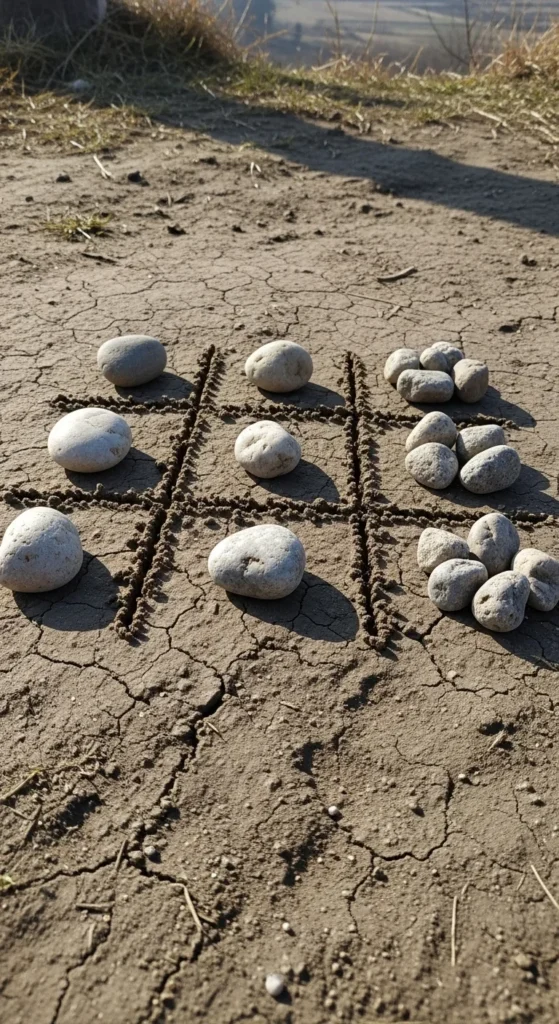 Stone tic-tac-toe boards mix outdoor play with simple strategy. Draw a grid in dirt, sand, or chalk on pavement. Use two sets of stones or pinecones as pieces. Kids take turns placing items and clearing the board for replay. This game encourages patience and turn-taking while staying active outside. Stones store easily for repeat use. Boards can be redrawn anywhere, making this a flexible activity during walks or backyard time.