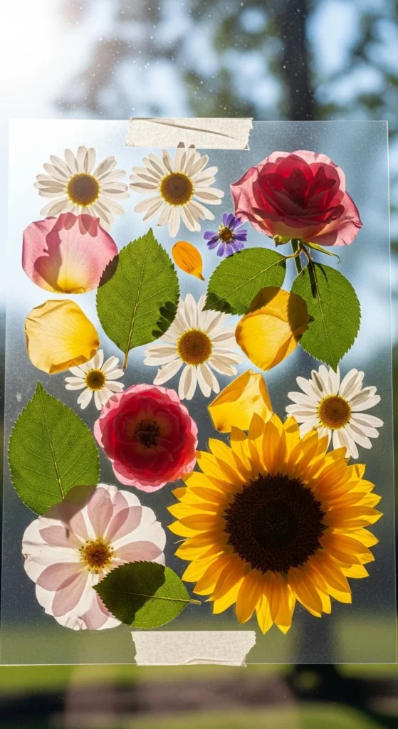 Sticky flower wall art is great for younger kids. Tape clear contact paper sticky-side-out onto a wall, window, or fence. Head outside and collect fallen petals, grass, and leaves. Press items onto the surface to create patterns. When finished, seal it with another sheet of contact paper. This craft builds hand control and focus without glue or paint. Display it in sunlight for a day or two before composting the materials. It works well as a short activity with very little setup or mess.
