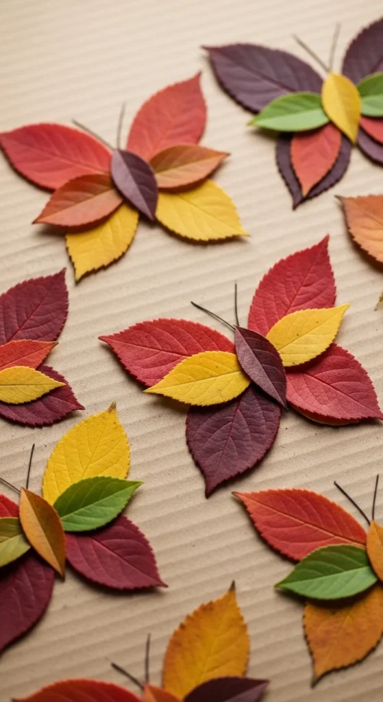 Leaf butterfly collages turn simple materials into creative designs. Collect leaves of different shapes and colors. Arrange them into butterfly wings on cardboard or thick paper. Use a small stick or stem as the body and glue everything in place. Kids enjoy matching wing sides and experimenting with patterns. This activity supports imagination while staying simple and affordable. Finished pieces can be taped to walls or windows for short displays.