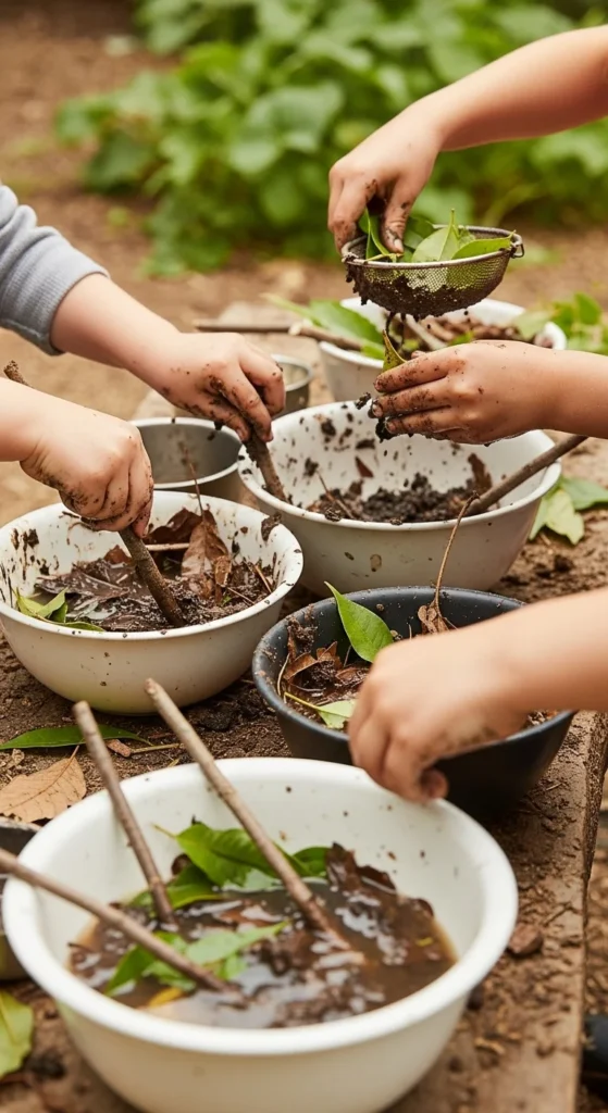 Mud kitchens allow open-ended outdoor play. Set out old bowls, spoons, and containers. Add soil and water and let kids mix mud, leaves, and petals. Keep the setup in one outdoor area to manage the mess. Cleanup only requires rinsing tools and hands. Adding pinecones, stones, and sticks keeps play going longer. Rotate materials weekly to maintain interest without extra cost.