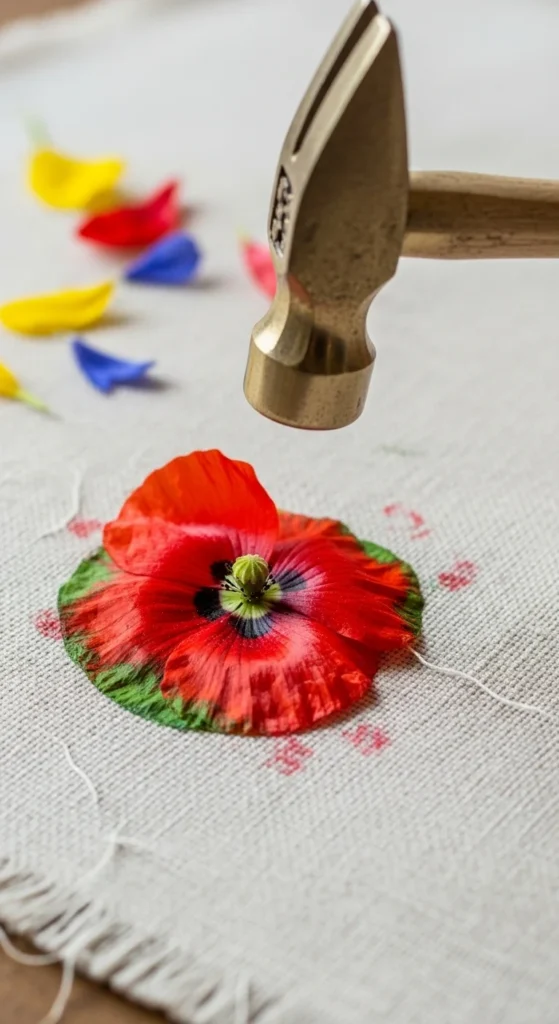 Flower pounding transfers color naturally onto fabric. Place flowers on cotton fabric and cover with another cloth. Tap gently with a stone or mallet until pigment appears. Let dry before use. Old napkins or tote bags work well. This process feels hands-on and creates unique results every time.