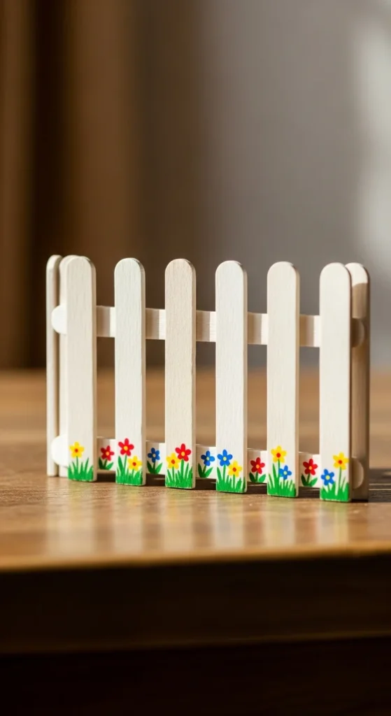 Glue popsicle sticks vertically side by side, then attach two horizontal sticks across the back to form a small fence. Paint it white or light brown. Add tiny painted flowers, paper grass, or small butterflies along the base. This mini fence looks cute as part of a larger craft scene or on a shelf. It’s simple to assemble and helps kids practice lining up shapes neatly.