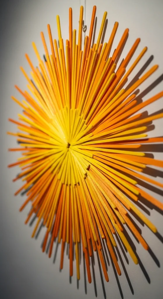 Arrange sticks in a circle with ends pointing outward like sun rays. Glue them onto a round cardboard base. Paint the center bright yellow and the rays in orange or gold. Add a string to hang it on a wall. This cheerful decoration brightens indoor spaces and is easy to customize with glitter or small bead accents.