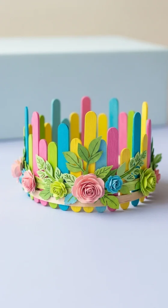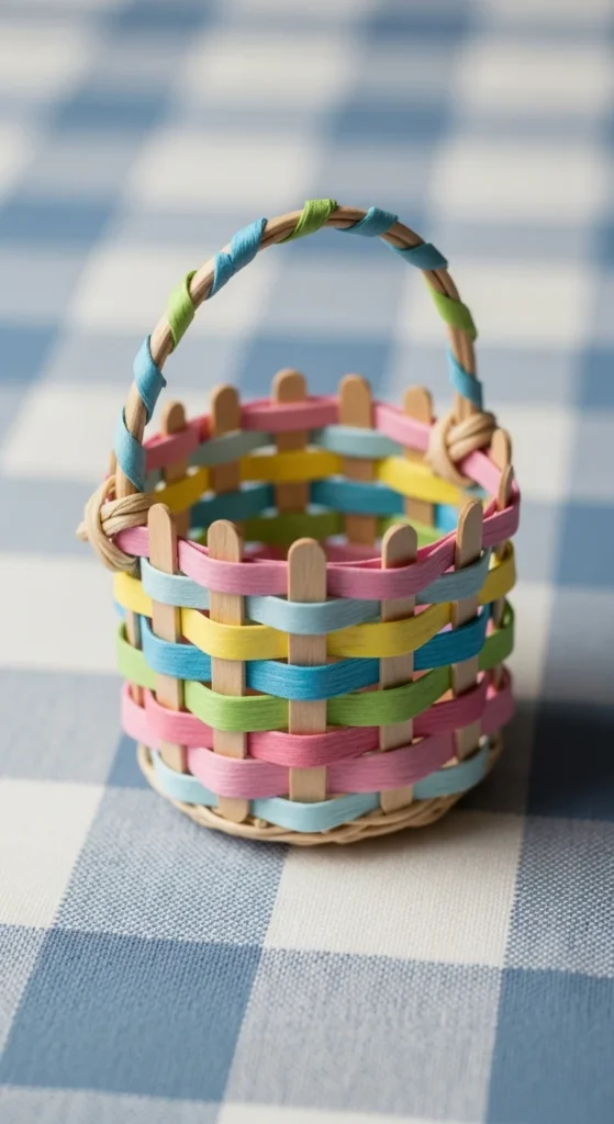 Glue sticks vertically around a small cardboard base to form basket sides. Wrap paper or thin ribbon around the outside for a woven look. Add a curved handle made from cardboard or a pipe cleaner. Paint in soft spring tones. This decorative basket can hold small paper flowers or candy for a spring display.