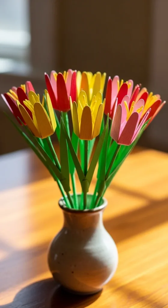 Paint sticks green for stems. Cut tulip-shaped petals from colored paper and glue them to the tops. Add leaves from green paper. Place several in a jar or paper vase. These never wilt and make bright decorations for desks or window sills.