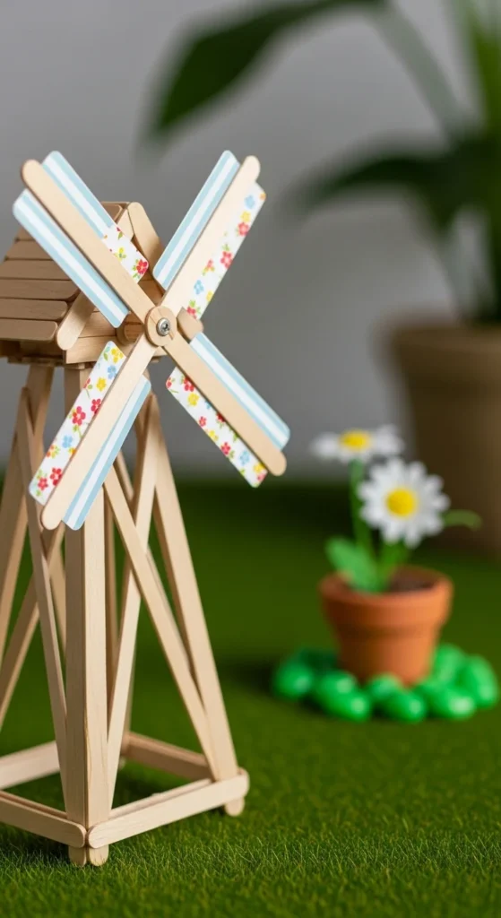 Create a cross shape with two sticks, then attach folded paper triangles as blades. Secure the center with a brad fastener so it can spin. Glue onto another stick as a stand. Kids enjoy watching the blades move when they blow on them.