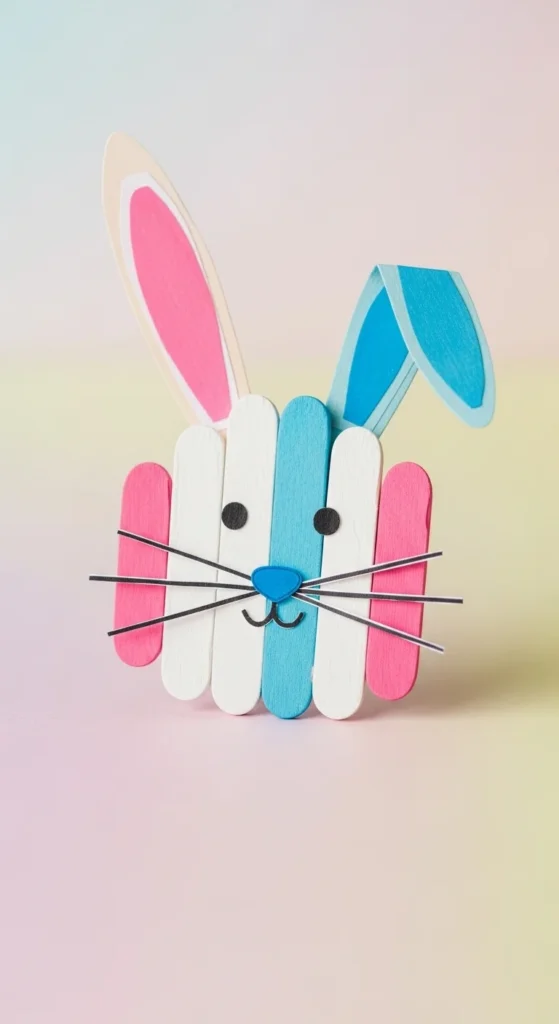 Glue sticks in a square, paint white or light gray, and add paper ears on top. Draw eyes, nose, and whiskers. This works well for spring and Easter décor and is simple for younger children.