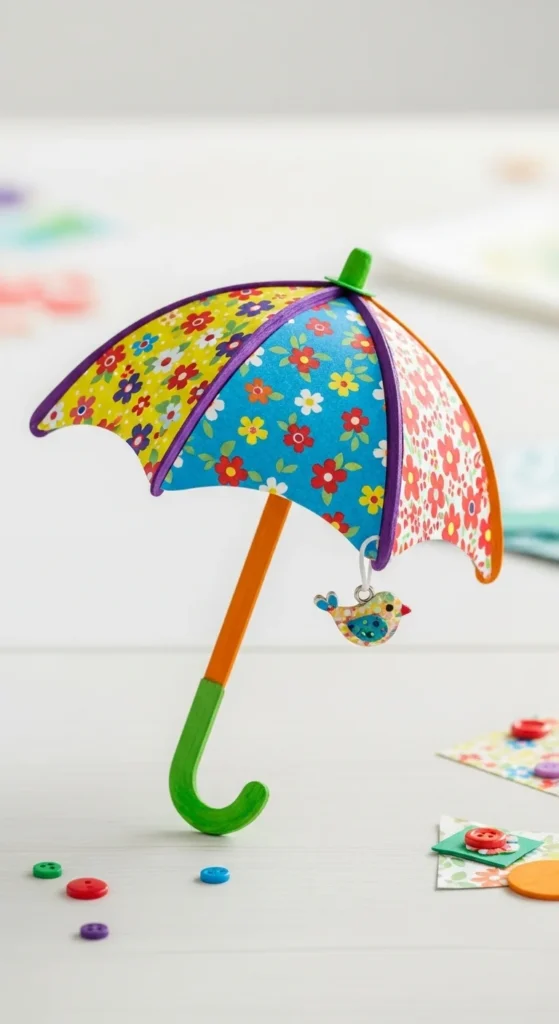 Use sticks for the handle and frame, then glue a half-circle paper canopy on top. Decorate with dots or stripes. This craft pairs nicely with spring rain themes in classrooms.