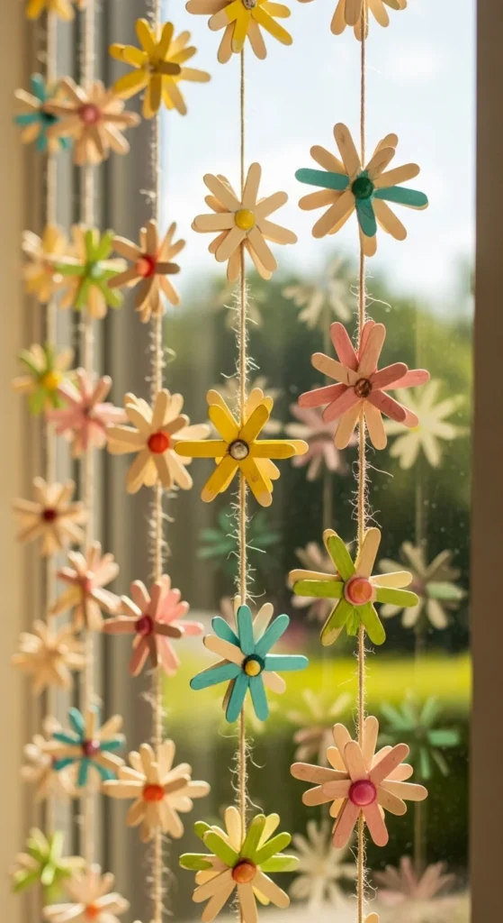 Make several small stick flowers and attach them to a long piece of string. Hang across a window or wall. The repeated shapes create a cheerful seasonal display.